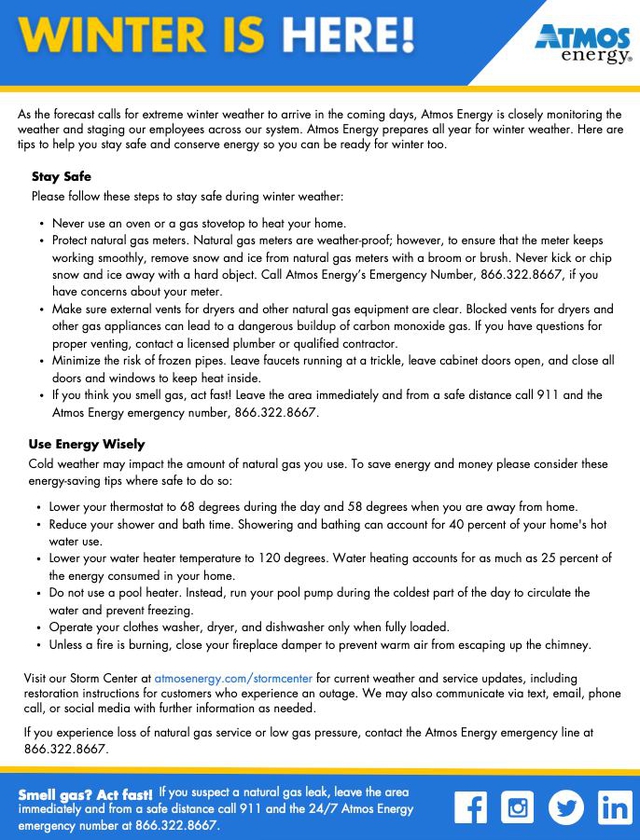 To report a gas leak, please contact Atmos Energy at 866-322-8667.