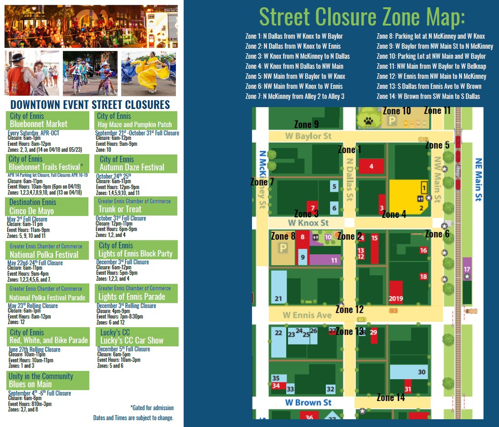 In support of the Bluebonnet Festival and associated activities, the City of Ennis will be undertaking a series of temporary road closures beginning Monday, April 13, 2026, to allow for the safe setup and operation of the Carnival, the Ennis Bluebonnet Run and various activities leading into the 74th annual Bluebonnet Festival, which officially begins on Friday, April 17, 2026.